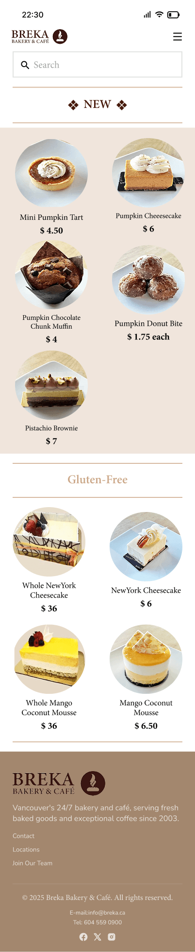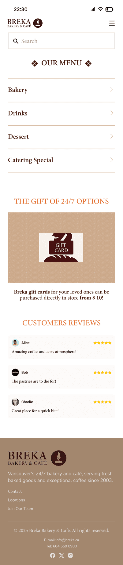 → A simplified footer that highlights Breka's brand story, contact details, and essential navigation links to improve credibility and accessibility.