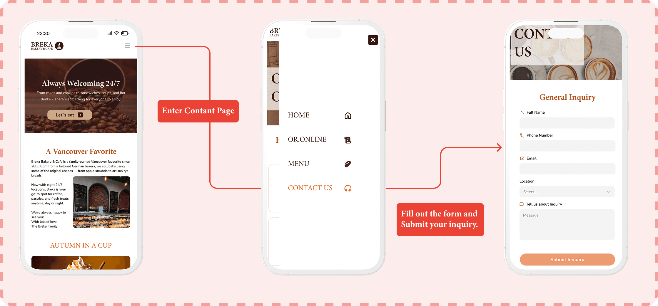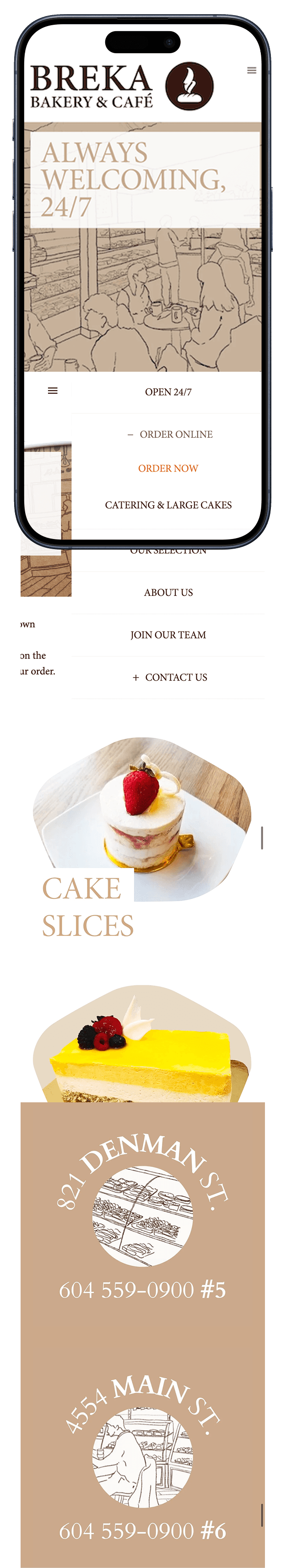 → A simplified navigation drawer that organizes Breka’s core services into clear categories, allowing users to browse Home, Online Orders, Catering, Menu, and Contact options with ease.