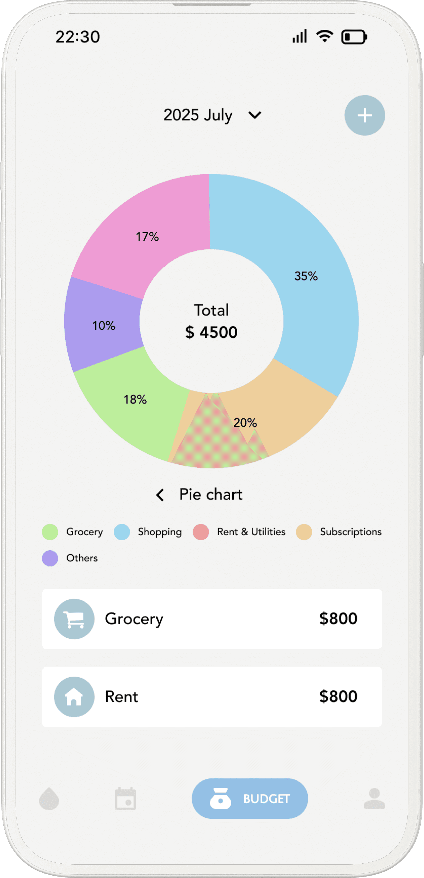 The pie chart emphasizes proportional spending, helping users understand how their total budget is distributed across categories.