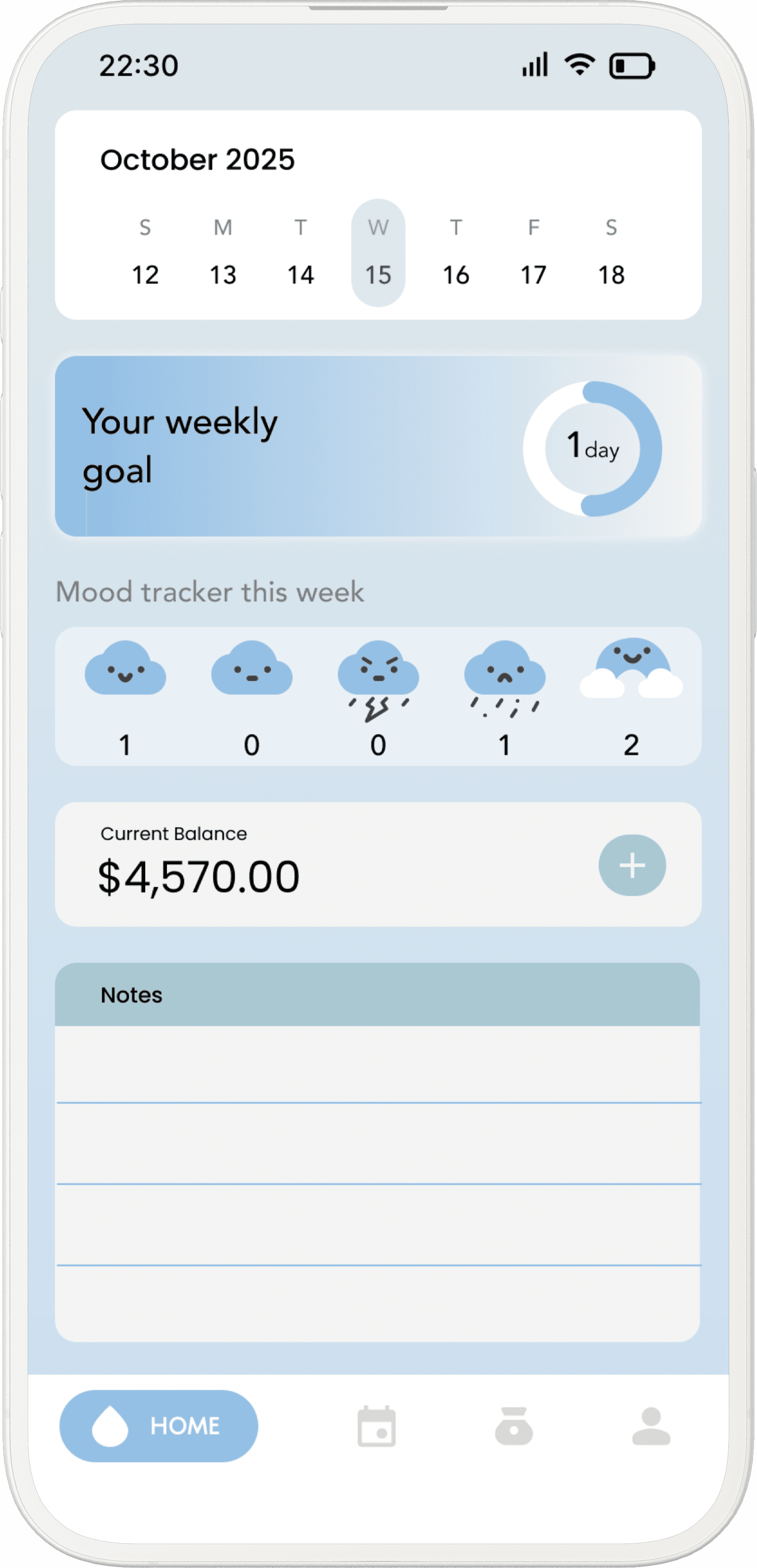 This screen provides a quick weekly overview by combining goals, mood tracking, budget status, and notes into a single, scannable dashboard.